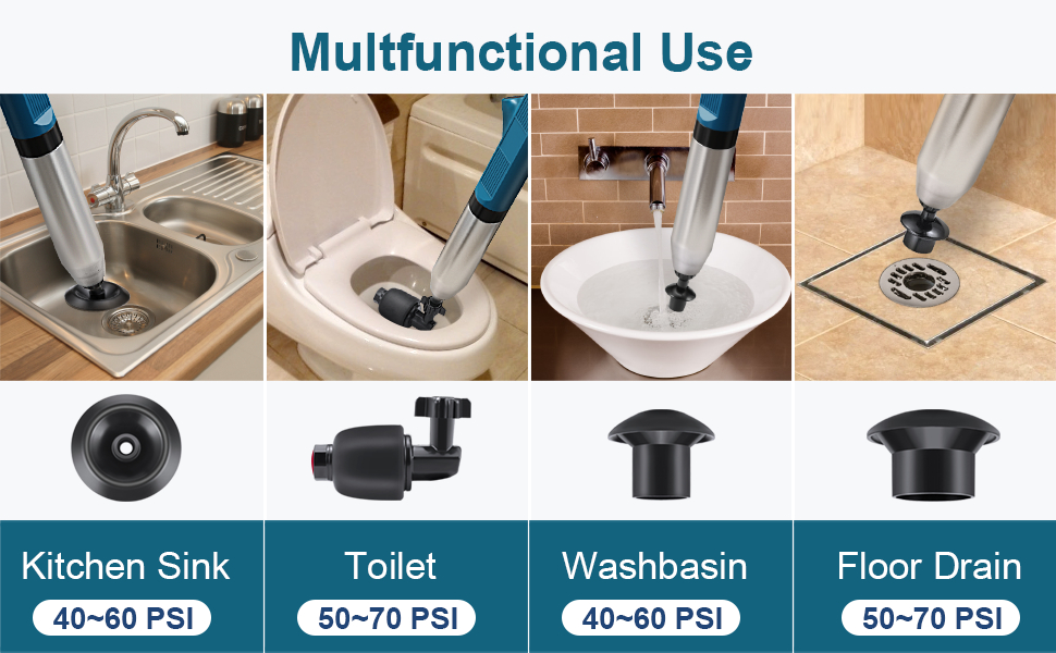 • Hiệu quả cao: Dụng cụ thông tắc cống, bồn cầu bằng khí nén có thể thông tắc các đường ống cống, bồn cầu bị tắc nghẽn do nhiều nguyên nhân khác nhau, bao gồm rác thải sinh hoạt, cặn bẩn, vật cứng,…